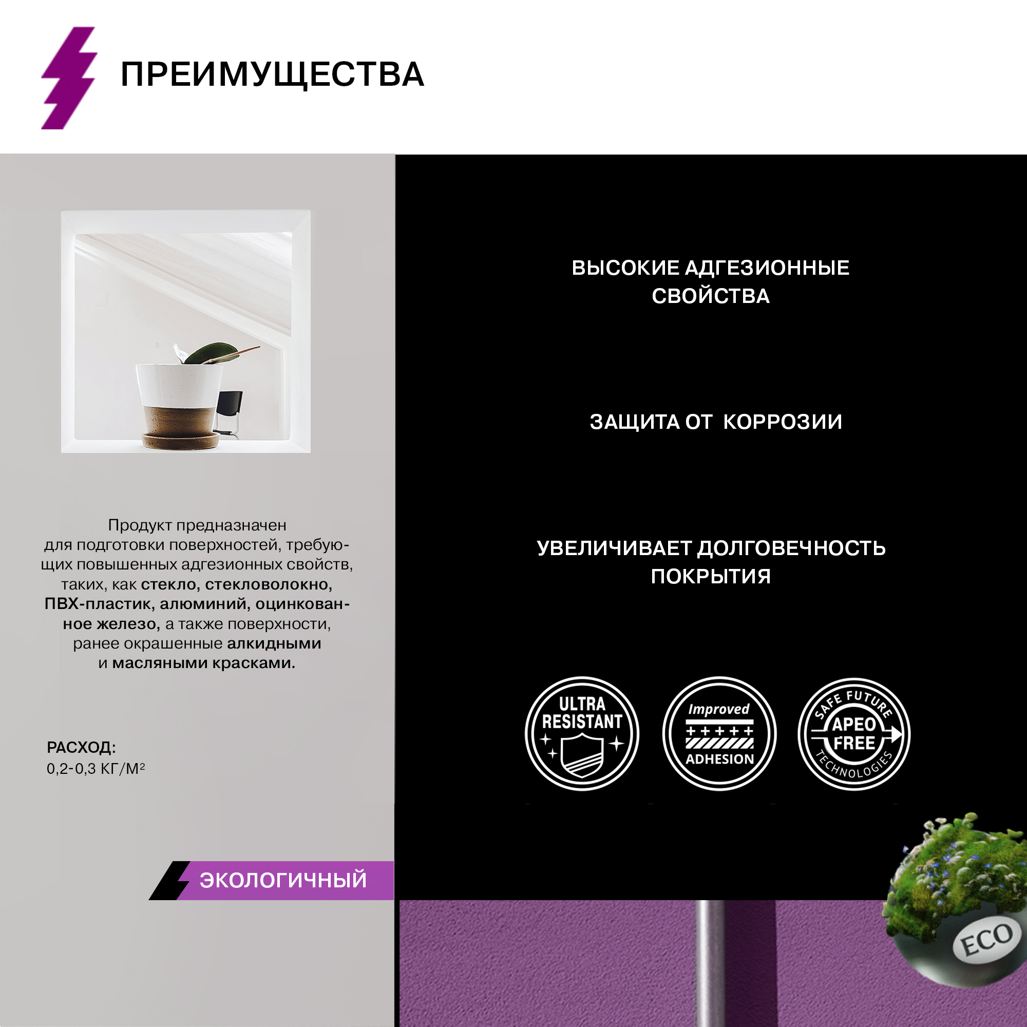Продукт предназначен для подготовки поверхностей, требующих повышенных адгезионных свойств, таких, как