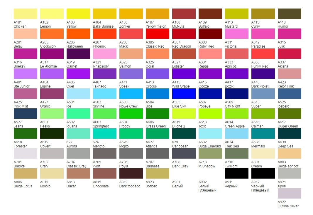Названия цветов: | Baby; Bios; Bozik; Buffalo; Chicken; Clockwork Crew; Cornflower; Covert; Crocus; Granit; Iceberg; Jeans; Le Atomse; Mack; Menthol; Mermaid; Military Shadow; Peeks; Phoenix; Pumpkin; Rhapsody; Salmon; Smoothie; Speak; Suga Emerald; Super; Toxic; Vanila; Бежевый Beige Apricot; Бежевый Beige Lotus; Бежевый Dakar; Бежевый Mokko; Белый Super; Белый White; Белый глянцевый White Gloss; Бледно-розовый Kelor Pink; Бронза Bronze; Голубой Blue Sky; Горчичный Mustard; Гранат Garnet; Желтый Baks Sunrise; Желтый DJ one 2; Желтый Yellow Cadmium; Желтый Yellow Melon; Желтый Zonker 207; Зеленая трава Grass Green; Зеленое яблоко Green Apple; Зеленый Cannabis; Зеленый Froggy; Золото Gold; Истинно-зеленый True Green; Коралловый Coral; Коричневый Macadamia; Коричневый Mr. Nuts; Красно-коричневый Horse; Красно-коричневый Ruby Red; Красный Classic Red; Маджента Akisha; Медь Cooper; Ментол White; Мохито Mojito; Небесно-голубой Skyline; Оранжево-красный Funky Red; Оранжевый Halloween; Оранжевый Lobster; Пастельно-оранжевый Belay; Розовый Julik; Розовый Paradise; Розовый Pink Mist; Розовый Princess; Светло-голубой Ice; Светло-зеленый Caterpillar; Светло-розовый Repas; Светло-серый Smoke; Светло-серый Wolf 745; Серо-зеленый Twilight; Серый Asphalt; Серый Classic Grey; Серый Poyla; Серый Sadness 748; Синий City Night; Синий NoWe Crew; Синий Popeye the sailor; Сиреневый Lupine; Телесный Cream 110; Темно-желтый Curry; Темно-зеленый Caribbean; Темно-зеленый Deep Sea; Темно-зеленый Forester 620; Темно-коричневый Dark Tobacco; Темно-красный Red Dragon; Темно-серый Grey dark; Утренняя заря Aurora; Фиолетовый Dark Violet; Фиолетовый Taknado; Фиолетовый Wild Grape; Фуксия Sneksy; Хаки Humor; Хром; Черный Black; Черный глянцевый Black Gloss; Шоколад Chocolate; Ярко-голубой Trek Sea Breez; Ярко-зеленый Atlantis, компьютерная колеровка по согласованию. |