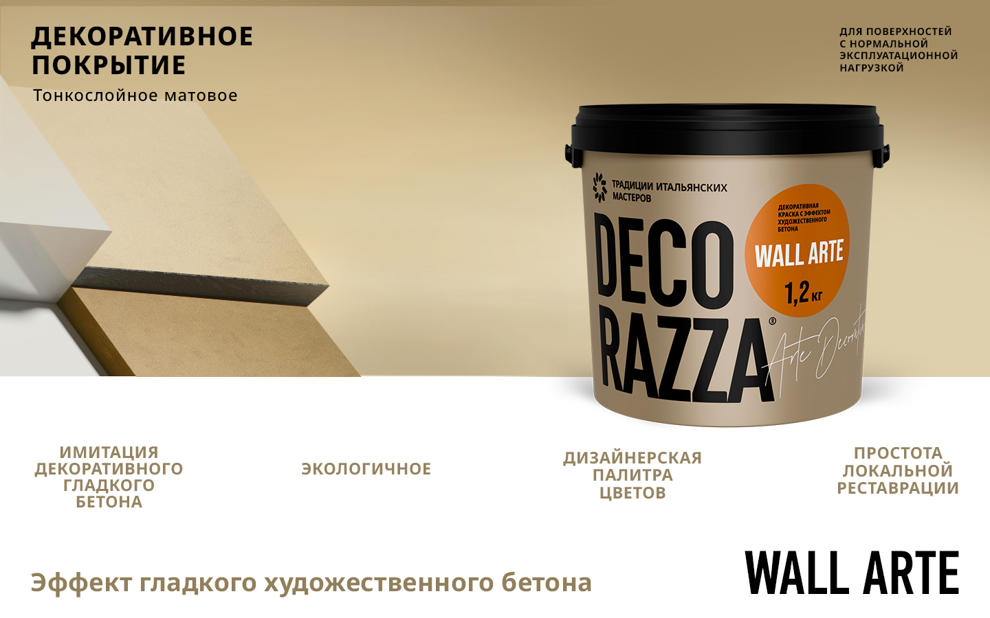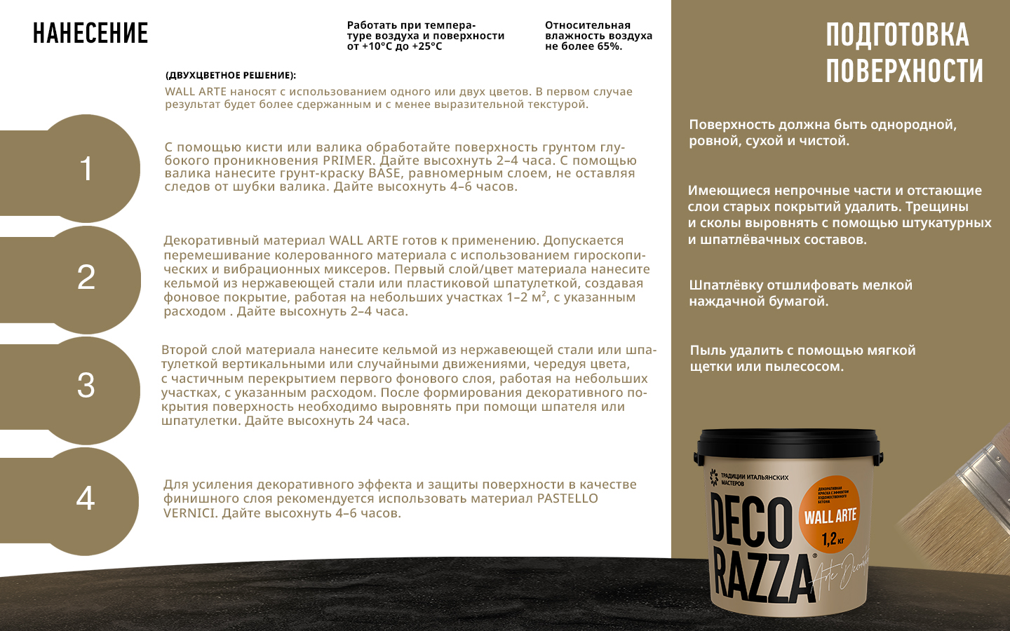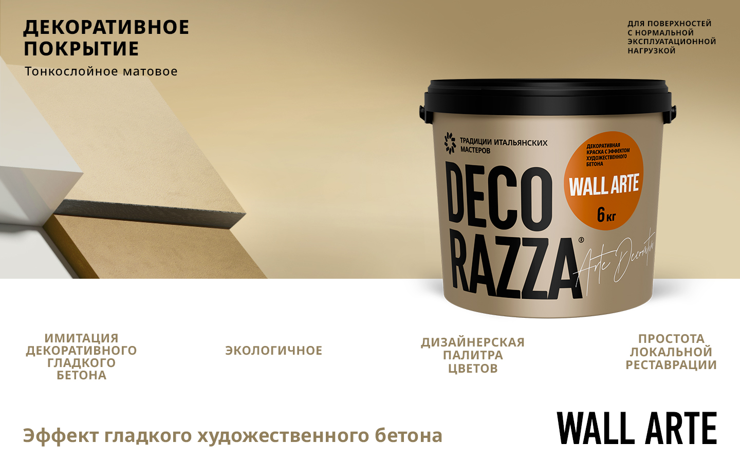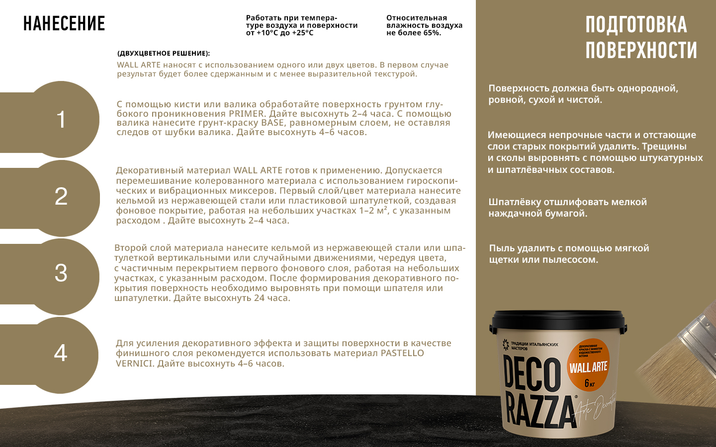 Декоративное покрытие с эффектом бетона WALL ARTE - Декоративное покрытие DECORAZZA WALL ARTE Откройте дверь в мир современного интерьера с помощью декоративного покрытия DECORAZZA WALL ARТЕ — идеального решения для стиля ЛОФТ. Это премиальное покрытие создает уникальный эффект бетона, добавляя вашему пространству изысканную фактурность и глубину. Благодаря своей высококачественной структуре, оно легко трансформирует стены, делая их центром внимания и подчеркивая индивидуальный вкус владельца. DECORAZZA WALL ARТЕ идеально подходит для создания атмосферных и стильных интерьеров, где каждый элемент важен и уникален. Применяйте его в жилых пространствах, офисах или кафе, чтобы придать дизайну современный, но в то же время урбанистический и теплый оттенок. Это покрытие не требует сложных навыков в нанесении и обеспечивает долговечность и устойчивость к износу, обеспечивая элегантный вид вашего помещения на долгие годы. от бренда Decorazza с доставкой по России!