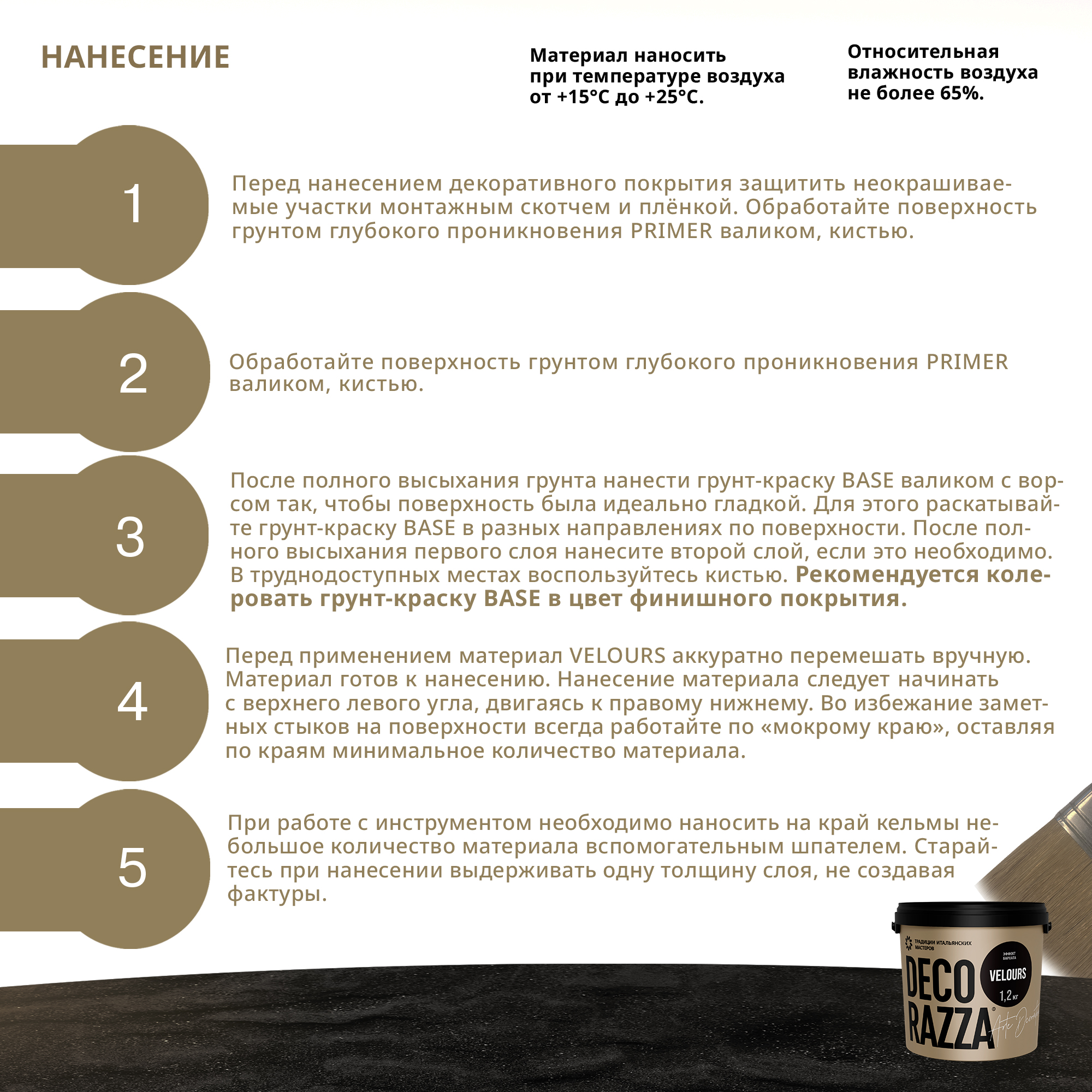 4. Перед нанесением материал VELOURS аккуратно перемешать вручную. Материал готов к нанесению. Нанесение материала следует начинать с верхнего левого угла, двигаясь к правому нижнему. Во избежание заметных стыков на поверхности всегда работайте по «мокрому краю», оставляю по краям минимальное количество материала.