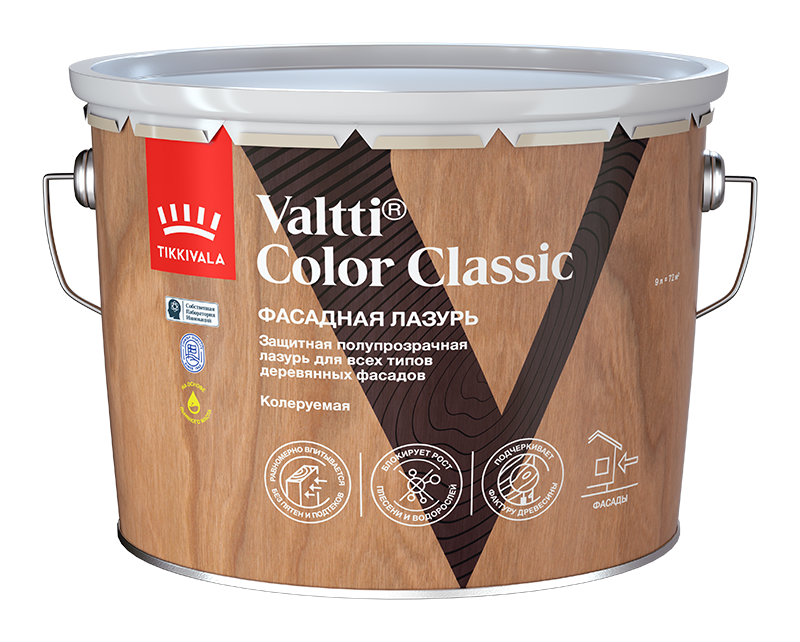 Деревозащитная лазурь VALTTI COLOR CLASSIC - Деревозащитная лазурь Tikkurila VALTTI COLOR CLASSIC Tikkurila VALTTI COLOR CLASSIC — это непревзойденное решение для защиты деревянных поверхностей. Эта колеруемая лазурь обладает уникальной способностью глубоко впитываться в дерево, обеспечивая его надежную защиту от атмосферных воздействий и предохраняя от грибка и плесени. Лессирующая формула обеспечивает естественность материала, подчеркивая текстуру дерева, что делает её идеальной для обработки бревен и фасадов домов. Валтти Колор гарантирует долговечное покрытие, сохраняющее свою яркость и защитные свойства на протяжении многих лет. Применяемая как для внутренних, так и для наружных работ, эта лазурь способствует сохранению натурального вида дерева, делая её идеальным выбором для экологичных и эстетичных фасадов. Тщательно разработанная для профессионалов и любителей, VALTTI COLOR CLASSIC гарантирует качество и долговечность вашего деревянного дома. от бренда Tikkurila с доставкой по России!