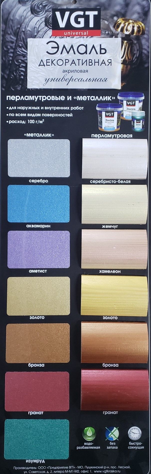 Эмаль перламутровая универсальная ВД-АК-1179 ВГТ - Универсальная перламутровая эмаль. Выпускается в нескольких цветах: «золото», «бронза», «серебристо-белая», «гранат», «жемчуг», «хамелеон». Может колероваться высококонцентрированными колеровочными пастами от бренда VGT-ecology material с доставкой по России!