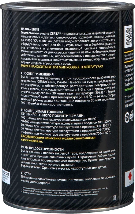 Термостойкая эмаль CERTA предназначена для защитной антикоррозионной окраски металлического оборудования, работающего в условиях повышенной температуры и влажности.