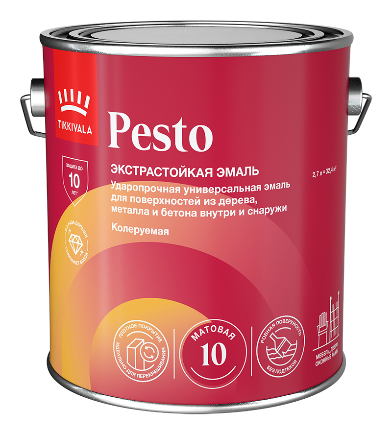Эмаль универсальная PESTO 10 (мат) - Эмаль универсальная Tikkurila PESTO 10 — это высококачественное покрытие на основе алкидной смолы, идеально подходящее для широкого спектра поверхностей. Её матовая текстура придает отделке элегантность и ненавязчивость, делая её идеальным выбором как для внутренних, так и для наружных работ. Эмаль универсальная Tikkurila PESTO 10 Представляем высококачественную алкидную эмаль PESTO 10 от Tikkurila — идеальное решение для любых отделочных проектов! Эта матовая эмаль предназначена для широкого спектра применения: от стен до окон, дверей и мебели. Её универсальность позволяет использовать её как по дереву, так и по металлу и бетонным поверхностям. ПЕСТО 10 отличается исключительной способностью к колеровке, позволяя создать индивидуальный дизайн вашего интерьера или экстерьера. Отличительная особенность данной эмали — отсутствие резкого запаха, что делает процесс покраски комфортным и безопасным для всех членов семьи. Применение PESTO 10 возможно как для наружных, так и для внутренних работ, обеспечивая долговечность и безупречный внешний вид поверхностей. Благодаря своим высоким защитным свойствам, эта эмаль гарантирует сохранность и эстетичность ваших объектов на протяжении многих лет. 10 отличается своей универсальностью: она подходит для окрашивания стен, окон, дверей, мебели, а также может использоваться для обработки дерева, металла и бетона. Благодаря возможности колеровки, вы сможете подобрать идеальный оттенок для любого проекта. Этот продукт выделяется отсутствием резкого запаха, что делает процесс покраски комфортным и безопасным для всех членов семьи. Tikkurila PESTO 10 гарантирует долговечное и качественное покрытие, обеспечивая защиту от атмосферных воздействий и механических повреждений. от бренда Tikkurila с доставкой по России!
