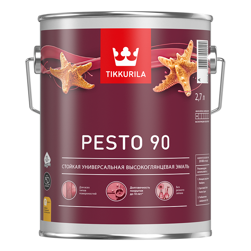 Эмаль универсальная PESTO 90 (глянц) - Эмаль универсальная Tikkurila PESTO 90 — это высококачественное покрытие, разработанное для обеспечения долговечности и элегантного вида поверхностей. Основана на основе алкидной смолы, эта эмаль отличается легкими оттенками растворителя, что делает её применение комфортным даже в закрытых пространствах. ПЕСТО 90 характеризуется высочайшей прочностью и гладкой, высокоглянцевой поверхностью, идеально подходящей как для наружных, так и для внутренних работ. Её универсальность позволяет использовать данное покрытие для самых разнообразных материалов: дерева, металла и бетона. Особенно хорошо подходит для отделки окон и дверей, обеспечивая их защиту от погодных условий и износа. Одним из преимуществ PESTO 90 является возможность колорирования, что позволяет подобрать идеальный оттенок для любого интерьера или экстерьера. Это делает её идеальным выбором для профессионалов и домашних мастеров, стремящихся к безупречному результату. от бренда Tikkurila с доставкой по России!