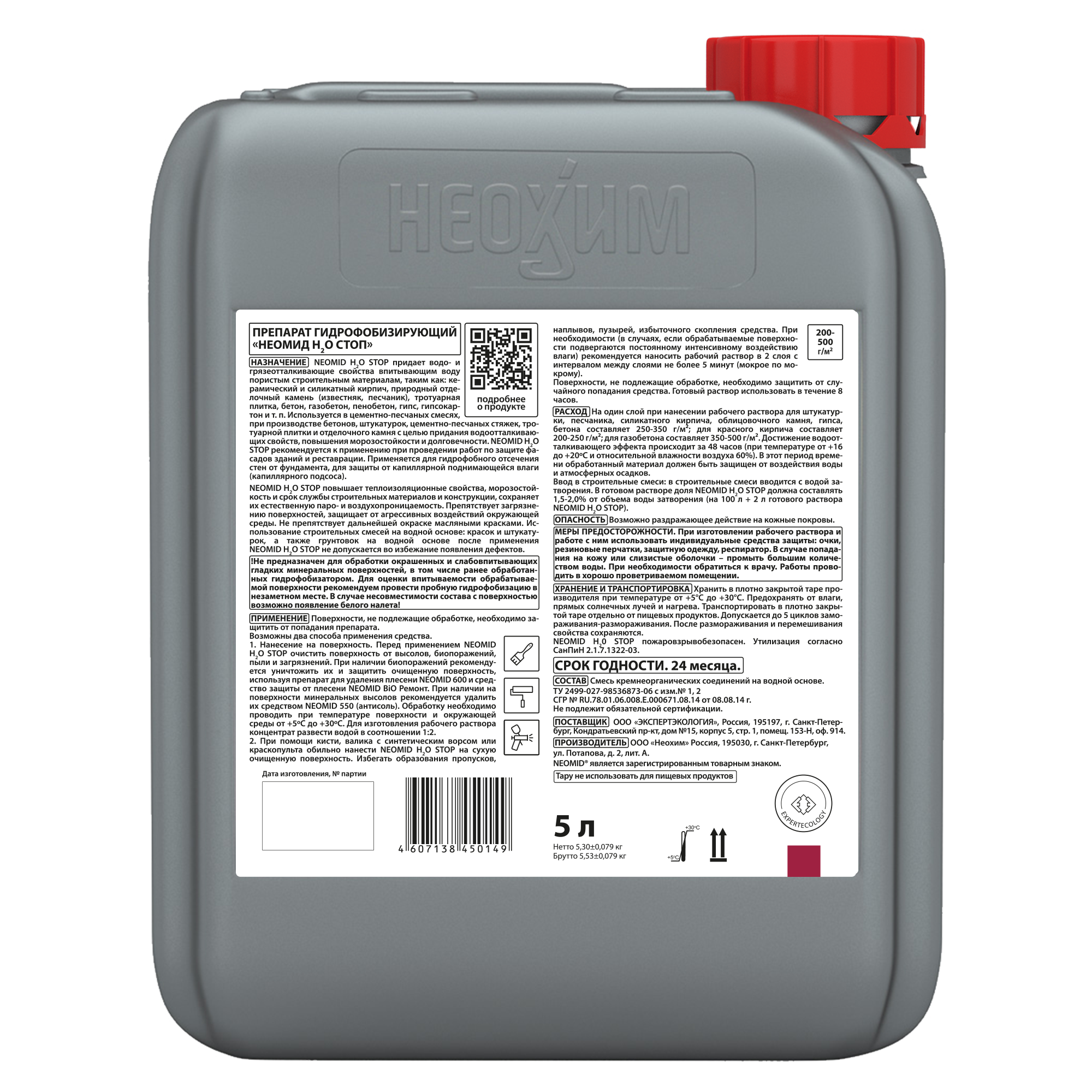 Гидрофобизатор Neomid H2O-Stop - Пропитка по камню NEOMID H2О STOP (концентрат). Используется в цементно-песчаных смесях, при производстве бетонов, штукатурок, цементно-песчаных стяжек тротуарной плитки и отделочного камня с целью придания водоотталкивающих свойств, повышения морозостойкости от бренда Neomid с доставкой по России!