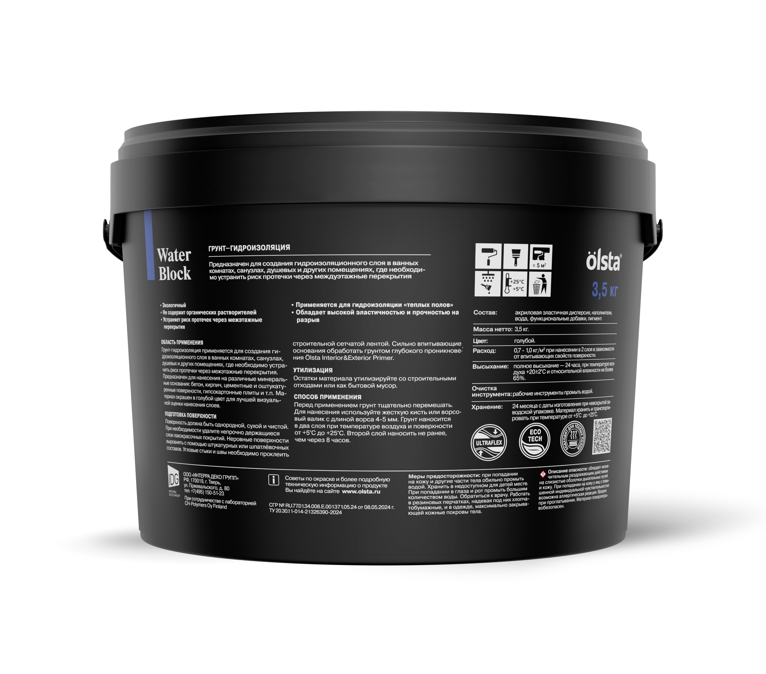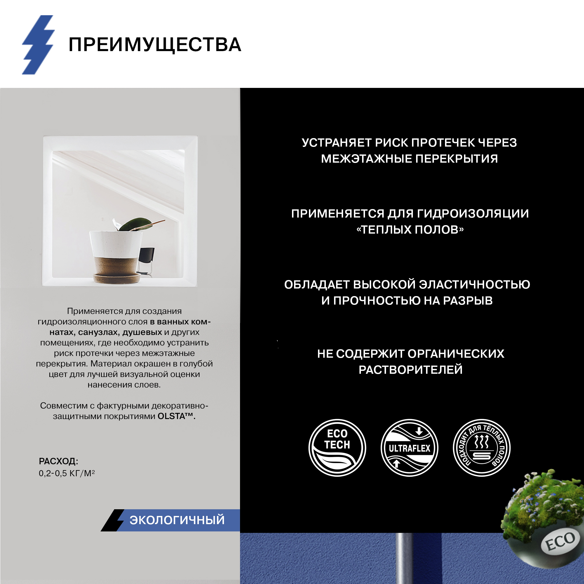 Грунт-гидроизоляция Olsta Waterblock предназначен для отделки ванных, санузлов, помещений с системами «теплый пол» и участками с повышенным риском протечки. Состав не содержит органических растворителей, для упрощения контроля за качеством нанесения производится в синем цвете. Готовое покрытие эластично, обладает высокой прочностью на разрыв.