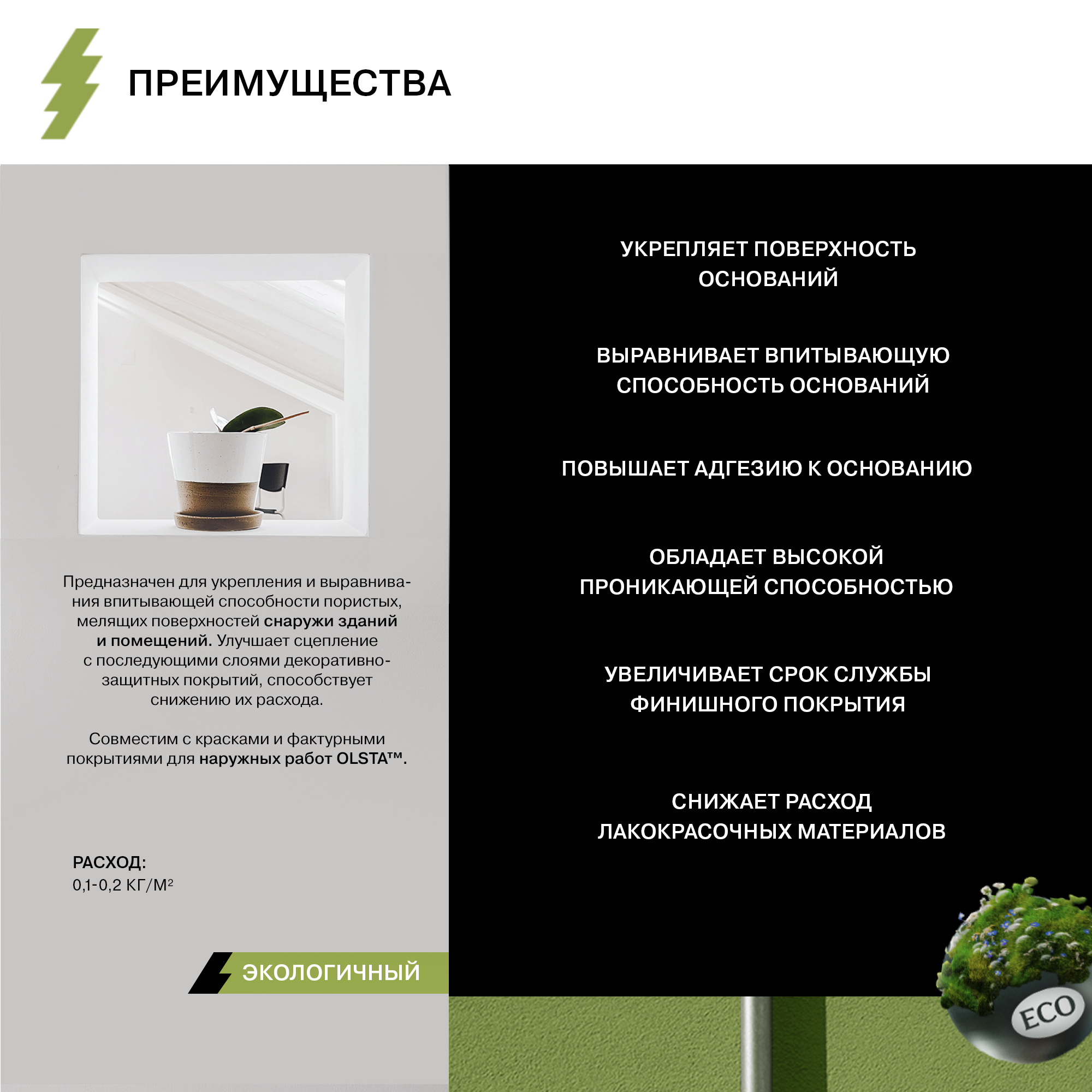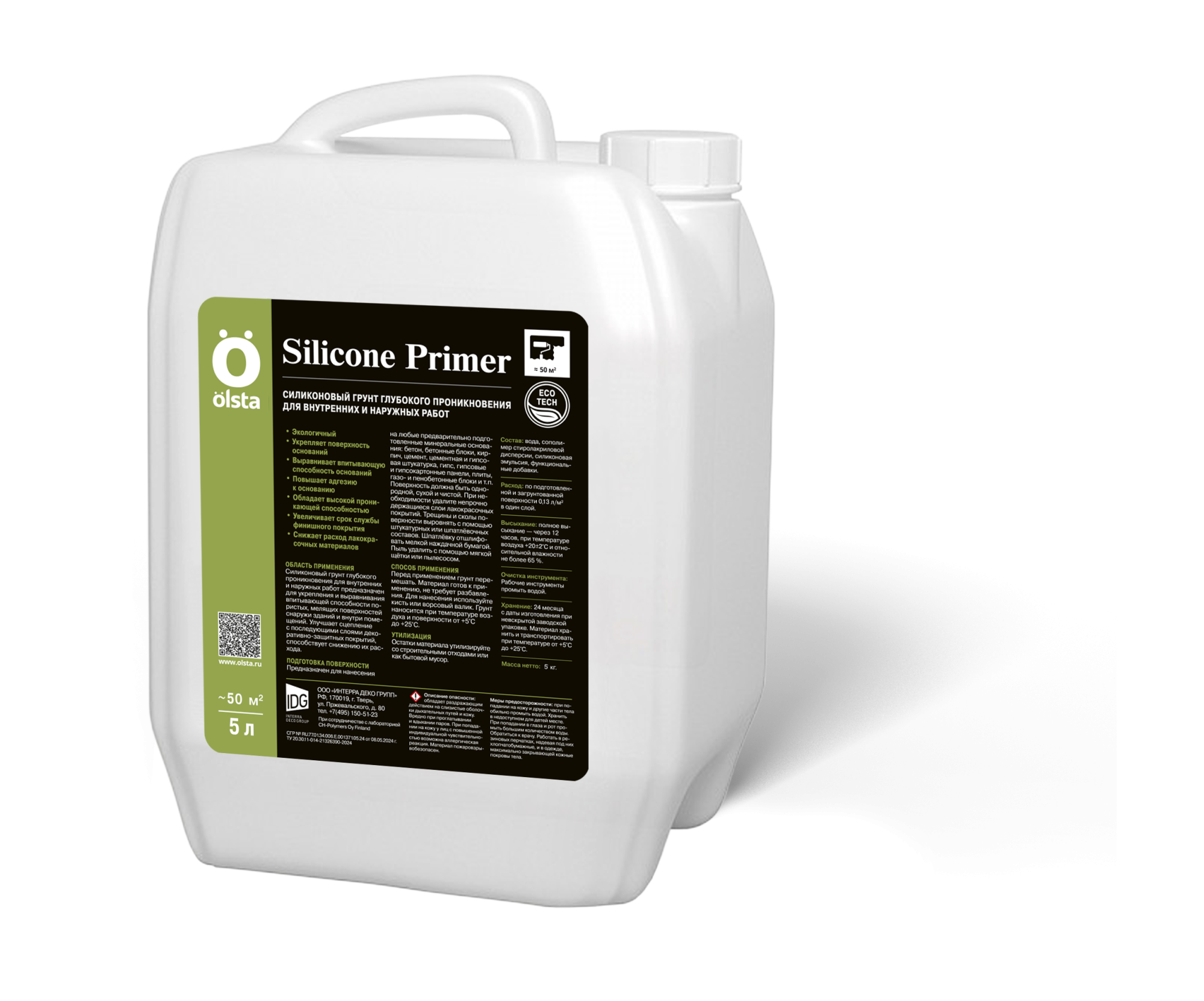 Грунтовка глубокого проникновения на силиконовой основе Olsta Primer Silicone обеспечивает укрепление непрочных поверхностей, снижает расход отделочных материалов, улучшает адгезию к декоративным покрытиям. Продукт отличается экологичностью, высокой проникающей способностью, повышает срок службы декоративной отделки за счет снижения риска отшелушивания и отслаивания.