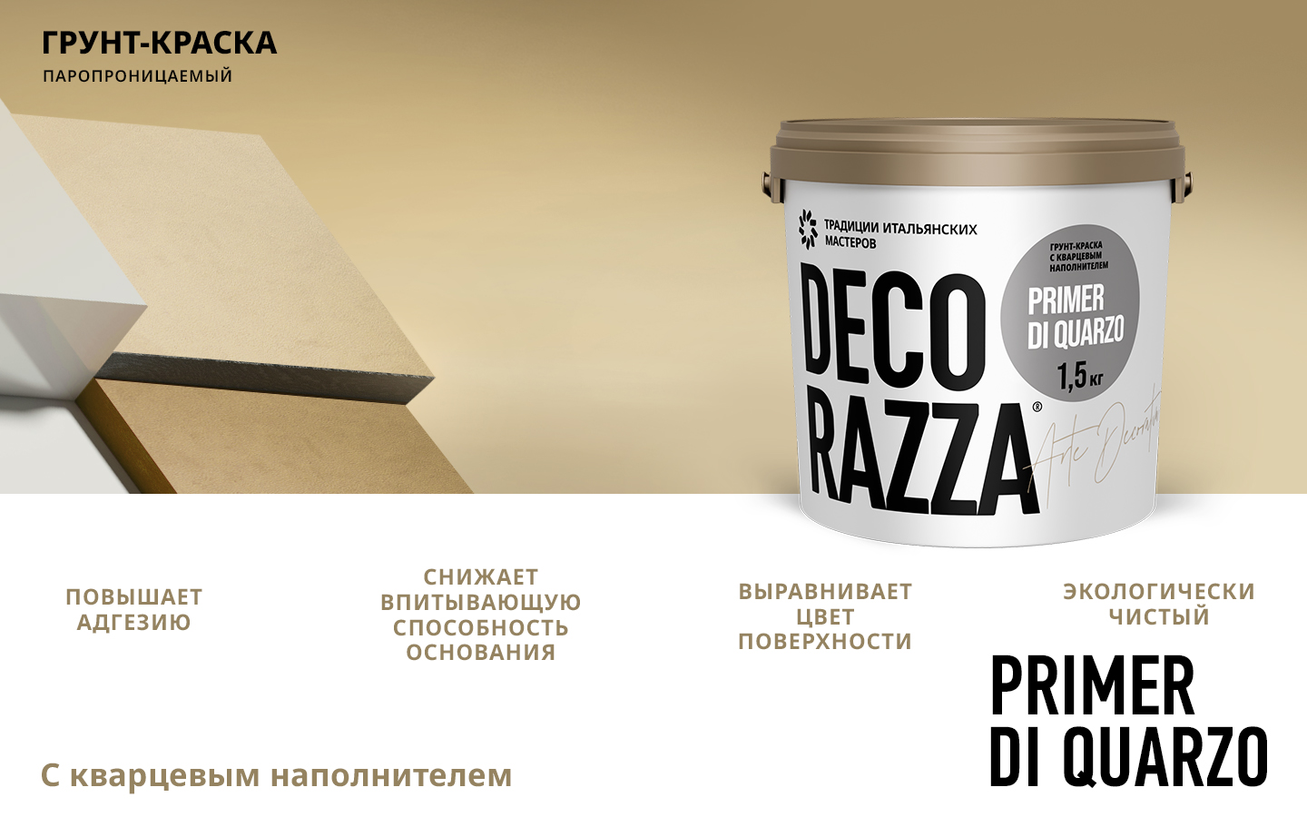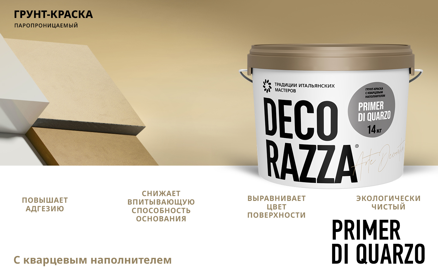 Для внутренних и наружных работ. Грунт-краска Primer di Quarzo применяется для цветового выравнивания подготавливаемой поверхности, а также для улучшения адгезии и удобства нанесения последующих финишных декоративных покрытий ТМ Decorazza.