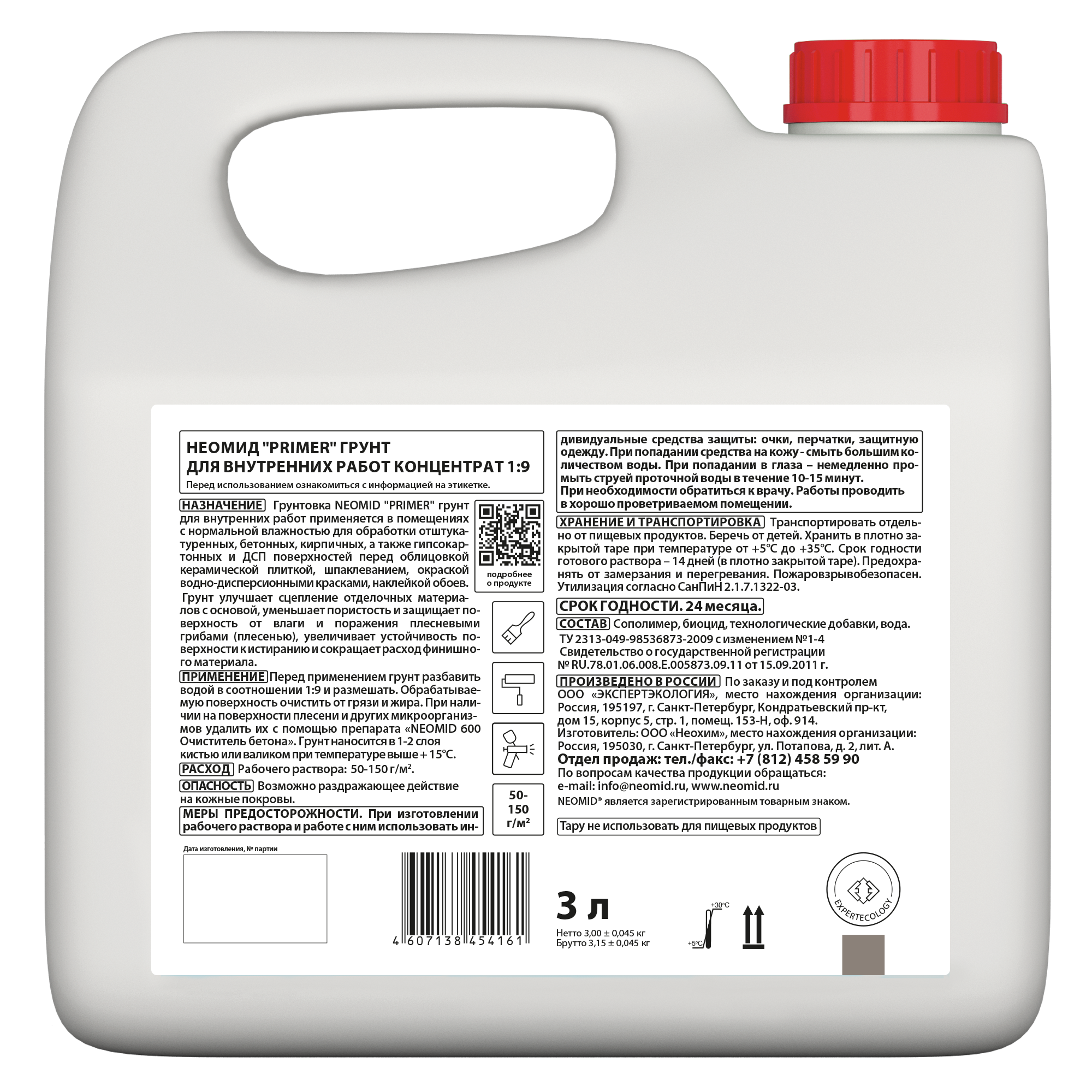 Грунтовка NEOMID «PRIMER» грунт для внутренних работ - применяется в помещениях с нормальной влажностью для обработки отштукатуренных, бетонных, кирпичных, а также гипсокартонных и ДСП поверхностей перед облицовкой керамической плиткой, шпаклеванием, окраской воднодисперсионными красками, наклейкой обоев.Грунт улучшает сцепление отделочных материалов с основой, уменьшает пористость и защищает поверхность от влаги и поражения плесневыми грибами (плесенью), увеличивает устойчивость поверхности к истиранию и сокращает расход финишного материала.