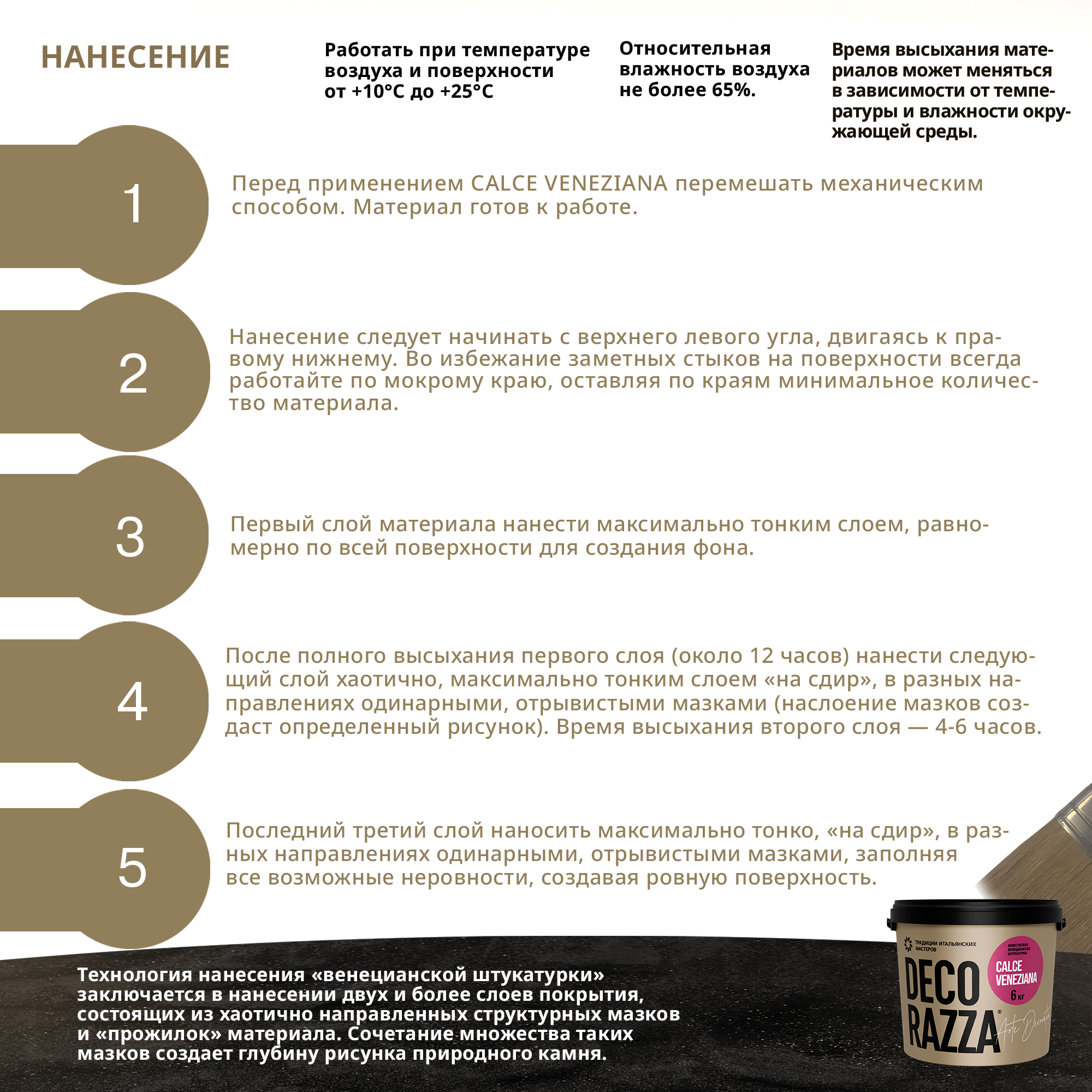 Подготовка поверхности и условия нанесения: Наносится на предварительно подготовленные минеральные основания. Поверхность должна быть ровной, сухой, прочной и чистой, без следов масел и жира. Обработать основание грунтом глубоко проникновения Primer ТМ Decorazza. Затем нанести грунткраску Base ТМ Decorazza так, чтобы поверхность была идеально гладкой. Calce Veneziana наносят после полного высыхания Base при температуре воздуха и поверхности 10-25°С и относительной влажности воздуха до 65%. Расход: 0,5-0,7 кг/м² при классическом нанесении