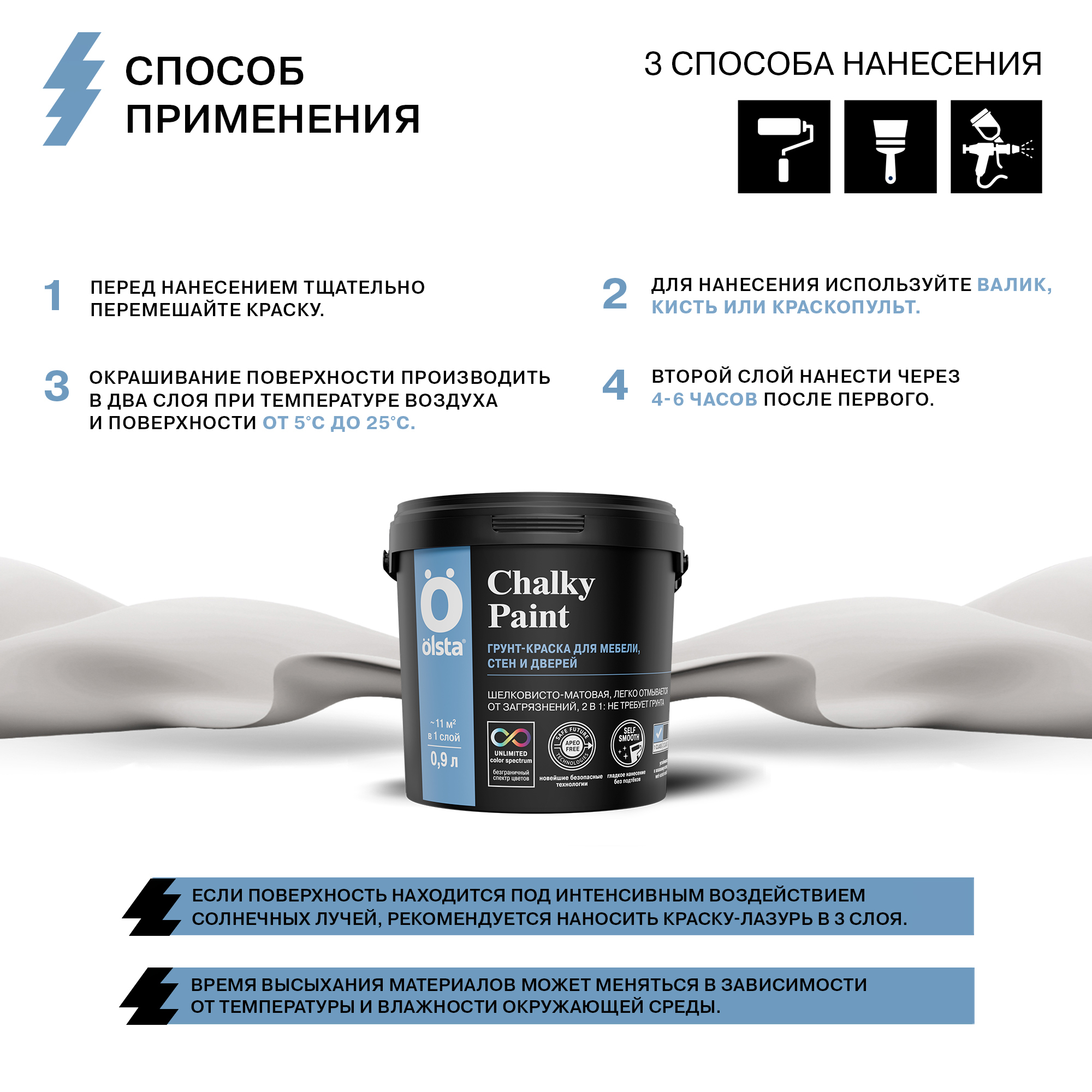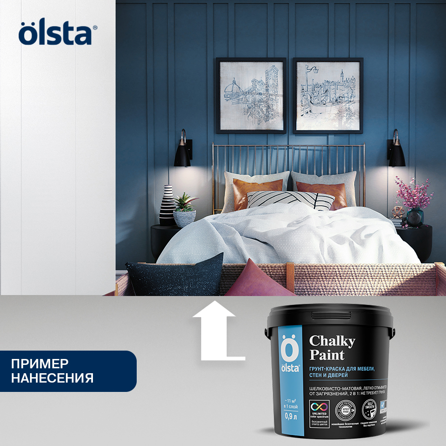 Краска для мебели меловая CHALKY PAINT - Краска для мебели меловая OLSTA CHALKY PAINT — это непревзойденное решение для тех, кто мечтает о стильной и долговечной мебели без лишних хлопот. Эта мебельная краска обладает уникальной матовой текстурой, напоминающей натуральный мел, что придает поверхности уютный и элегантный вид. Экологичная формула на водной основе гарантирует отсутствие неприятного запаха, делая процесс окрашивания комфортным как для вас, так и для вашего дома. OLSTA CHALKY PAINT отличается своей стойкостью к износу, обеспечивая долгие годы безупречного вида вашей мебели. Благодаря возможности колерования, вы можете подобрать идеальный оттенок под любой интерьер, создавая неповторимую атмосферу в каждом уголке вашего пространства. Используйте эту краску для обновления старых вещей или придания оригинальности новым предметам мебели, наслаждаясь безопасностью и качеством продукта, который отвечает всем современным требованиям экологии и дизайна. от бренда OLSTA с доставкой по России!