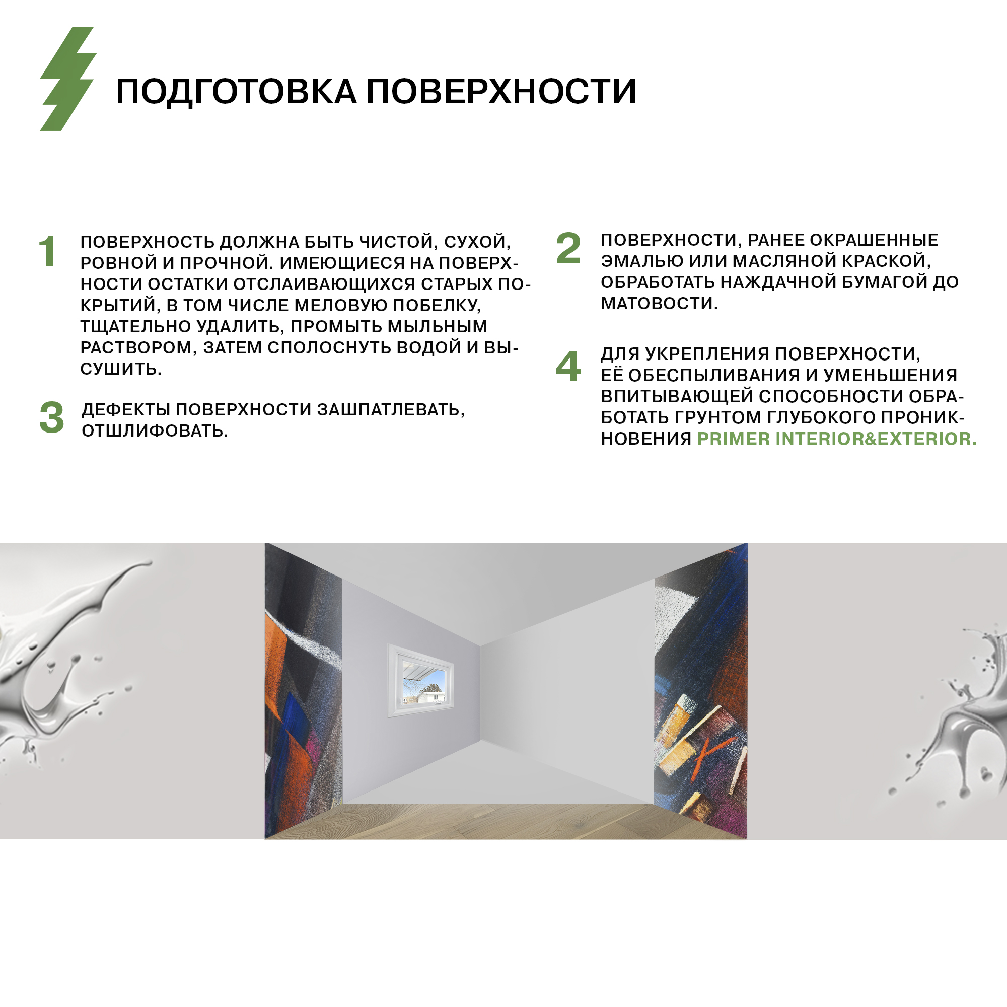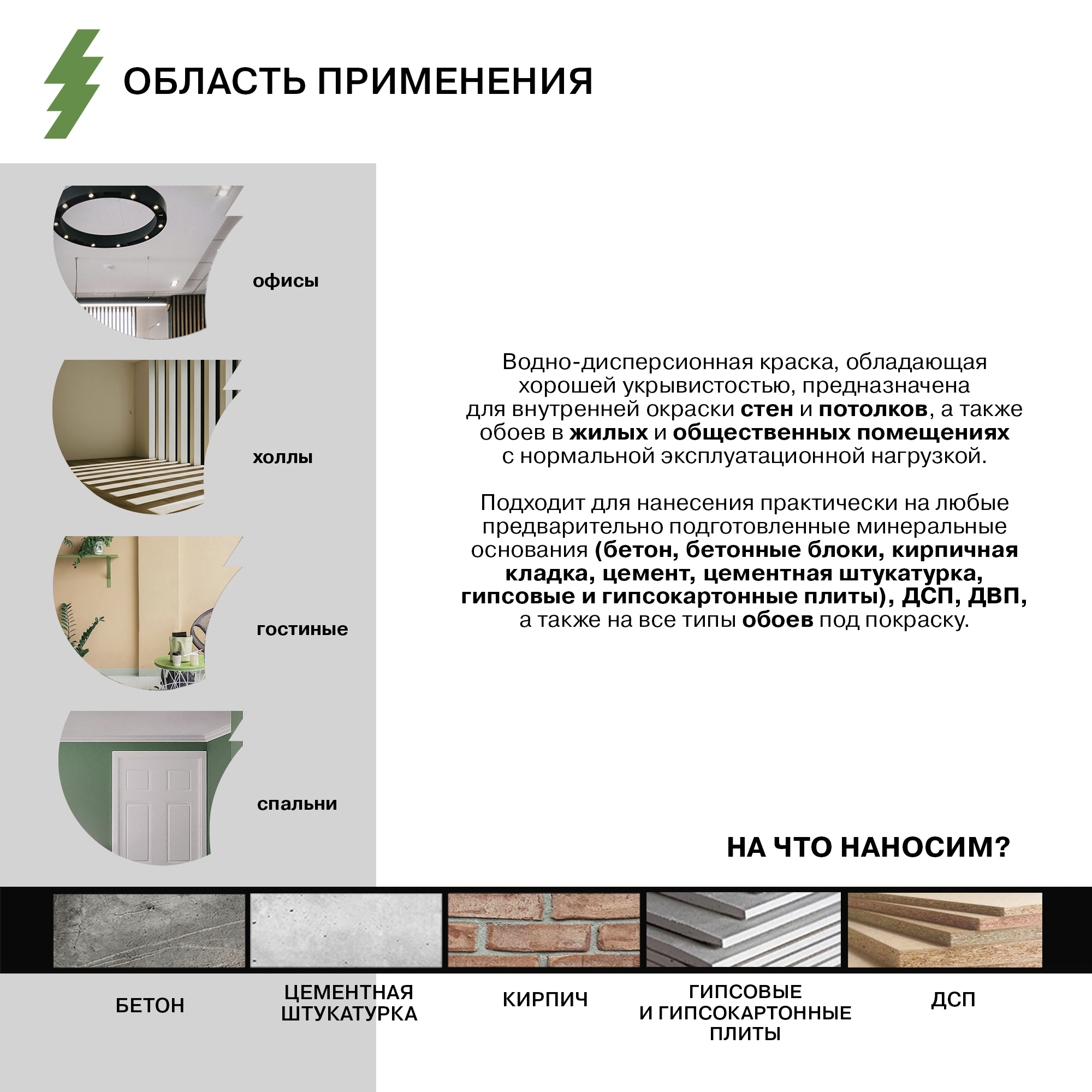 Водно-дисперсионная краска, обладающая хорошей укрывистостью, предназначена для внутренней окраски стен и потолков, а также обоев в жилых и общественных помещениях, с нормальной эксплуатационной нагрузкой.