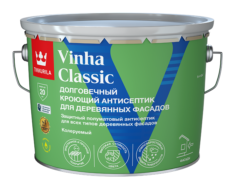 Кроющий антисептик Vinha Classic - Кроющий антисептик Vinha Classic — это профессиональное решение для защиты деревянных срубов и фасадных конструкций из дерева. Водоразбавляемая формула обеспечивает легкость нанесения и безопасную экологичность. Vinha Classic глубоко проникает в поры дерева, обеспечивая надежную защиту от грибков, плесени и насекомых, что особенно важно для деревянных срубов. Этот антисептик не только сохраняет природную красоту материала, но и продлевает срок службы деревянной конструкции, обеспечивая её устойчивость к внешним воздействиям природы. от бренда Tikkurila с доставкой по России!