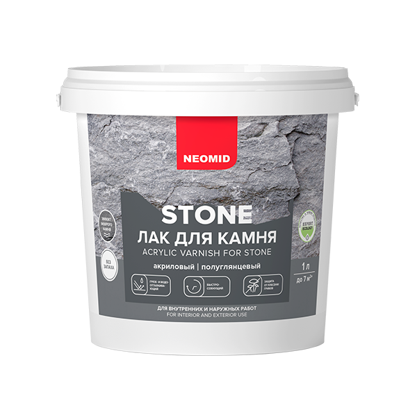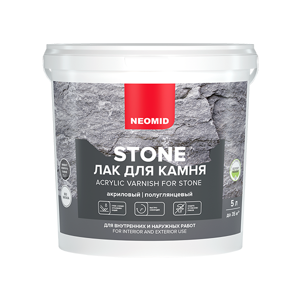 NEOMID Stone – лак на акриловой основе с эффектом «мокрого камня» для наружных и внутренних работ, практически не имеет запаха. Образует прочное прозрачное покрытие, увеличивает атмосферо- и влагостойкость обрабатываемых материалов, предназначен для защитно-декоративного покрытия кирпича, искусственного и натурального декоративного камня, бетона, черепицы, известняка внутри и снаружи помещений. Предотвращает появление плесени, высолов, защищает от воздействия атмосферных осадков. Сохраняет декоративные и защитные свойства в течение длительного времени. Не содержит растворителей.