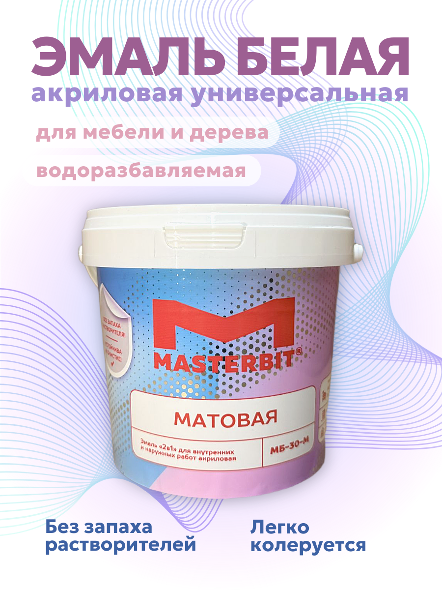 МБ-30 эмаль акриловая UNIVERSAL (матовая) - Эмаль акриловая универсальная МАСТЕРБИТ МБ-30 — это высококачественное покрытие, идеально подходящее для широкого спектра задач как в домашних условиях, так и на профессиональных объектах. Её особенность — отсутствие запаха, что делает работу с ней комфортной и безопасной для всех членов семьи. Водоразбавляемая формула обеспечивает легкость нанесения и удаления остатков краски. Мастербит МБ-30 обладает уникальным матовым эффектом, создающим гладкую и элегантную поверхность, которая подходит для различных материалов: дерева, загрунтованного металла и бетона. Благодаря своей универсальности, эта эмаль одинаково успешно применяется как для наружных, так и для внутренних работ, обеспечивая долговечность и устойчивость к атмосферным воздействиям. Используйте Мастербит МБ-30 для создания защищенного и эстетичного интерьера или для обновления фасадов зданий, получая безупречные результаты с минимальным усилием. от бренда Мастербит с доставкой по России!